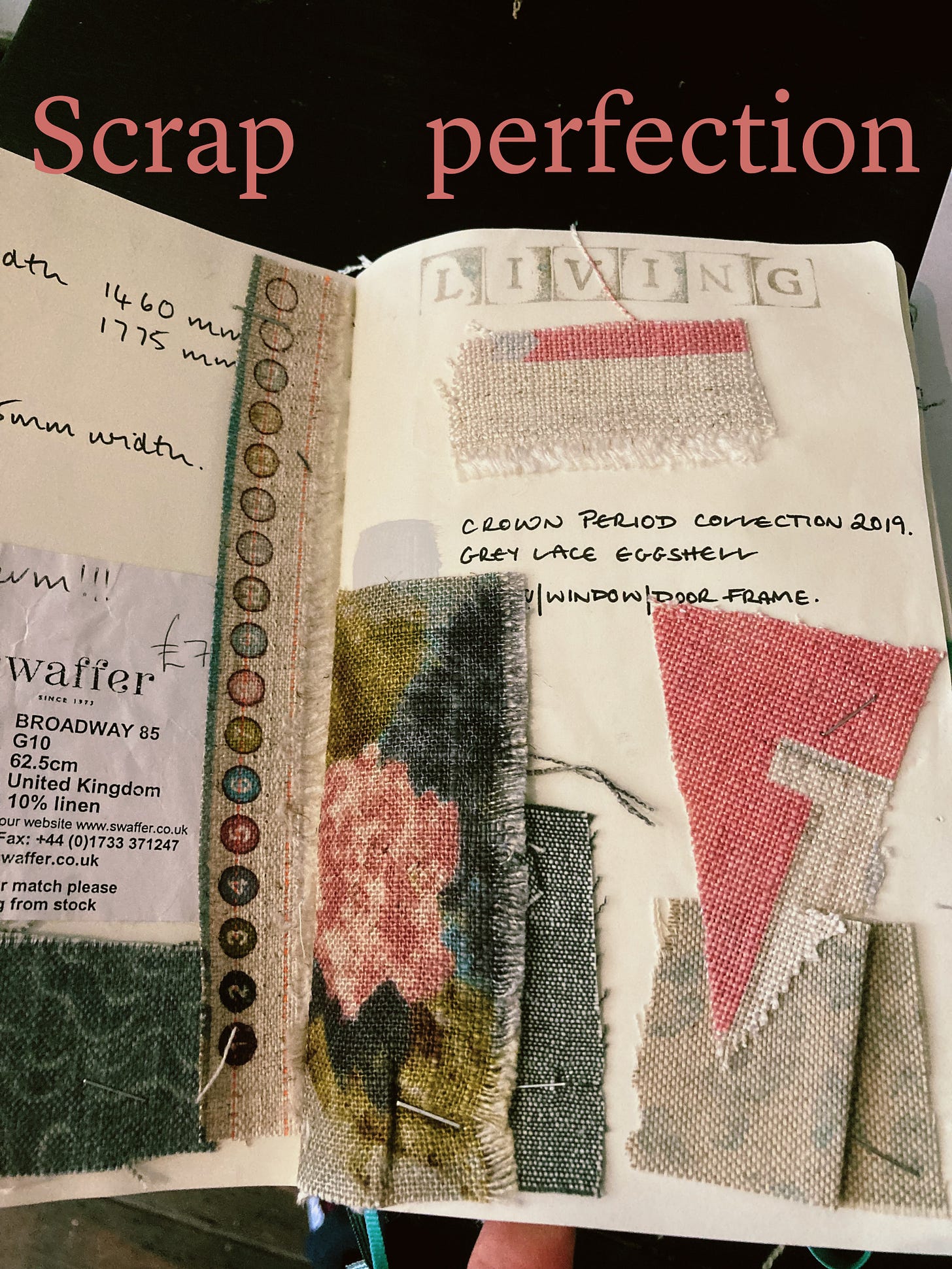 Begin with the feelings of liking something and let the good ones grow. Collecting bits of inspiration in a book seems to be a tried and tested way of starting and I always lean to a small notebook I can staple fabric in, stick down cuttings, pocket torn off sheets at the back, colour in and take with me when I’m making conscientious purchases. Hopefully, in time some of my Design notes will appear in your little books. Your book, your designs, your identity. These books will naturally become a small version of you. Perhaps, like me, if you’re not confident with drawing, your book might just end up being full of fabric swatches and lists. I love both!
