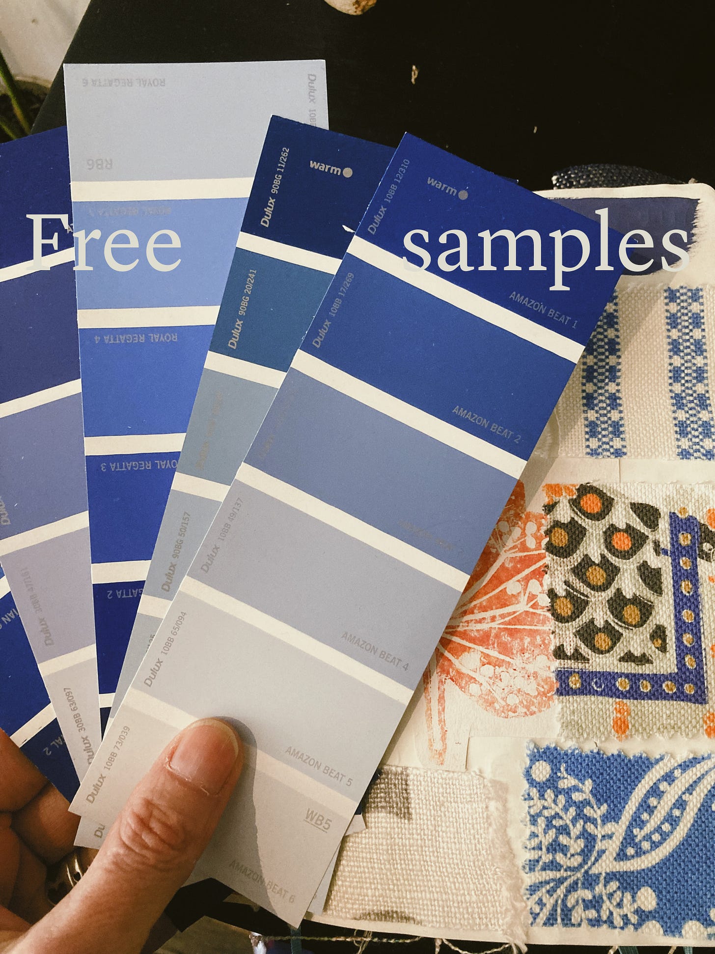 Visit the local recycling centre; I’ve found full fabric sample packs there which are great to dismantle and use for swatches.